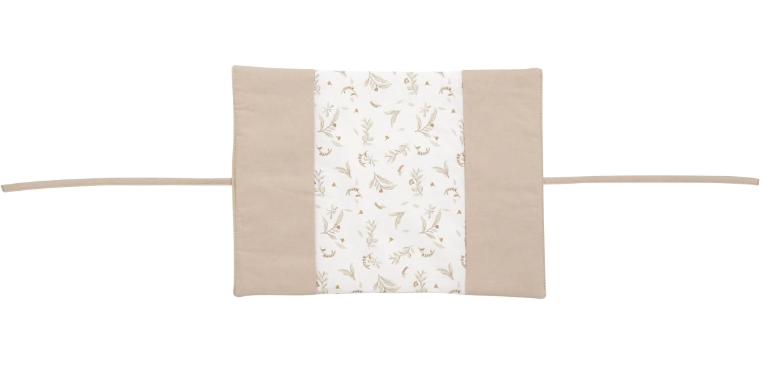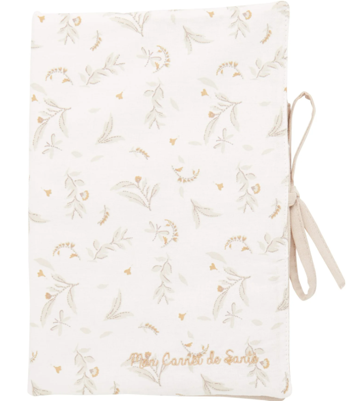 Un protège carnet de santé joli et pratique en pur coton, légèrement rembourré. Rabats à l'intérieur et liens à nouer sur le côté. Broderie Mon carnet de santé sur le devant.
